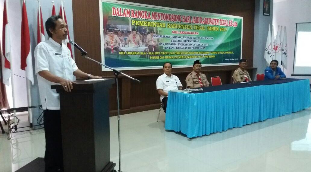 Slawi – Bagian Kesejahteraan Rakyat Setda Kabupaten Tegal, gelar sosialisasi Undang-undang (UU) Nomor 40 tahun 2009 tentang Kepemudaan dan UU No 12 Tahun 2010 tentang Gerakan Pramuka terhadap berbagai Organisasi Kepemudaan (OKP) se Kabupaten Tegal di Gedung PMI Kabupaten Tegal Rabu (10/5/2017).
