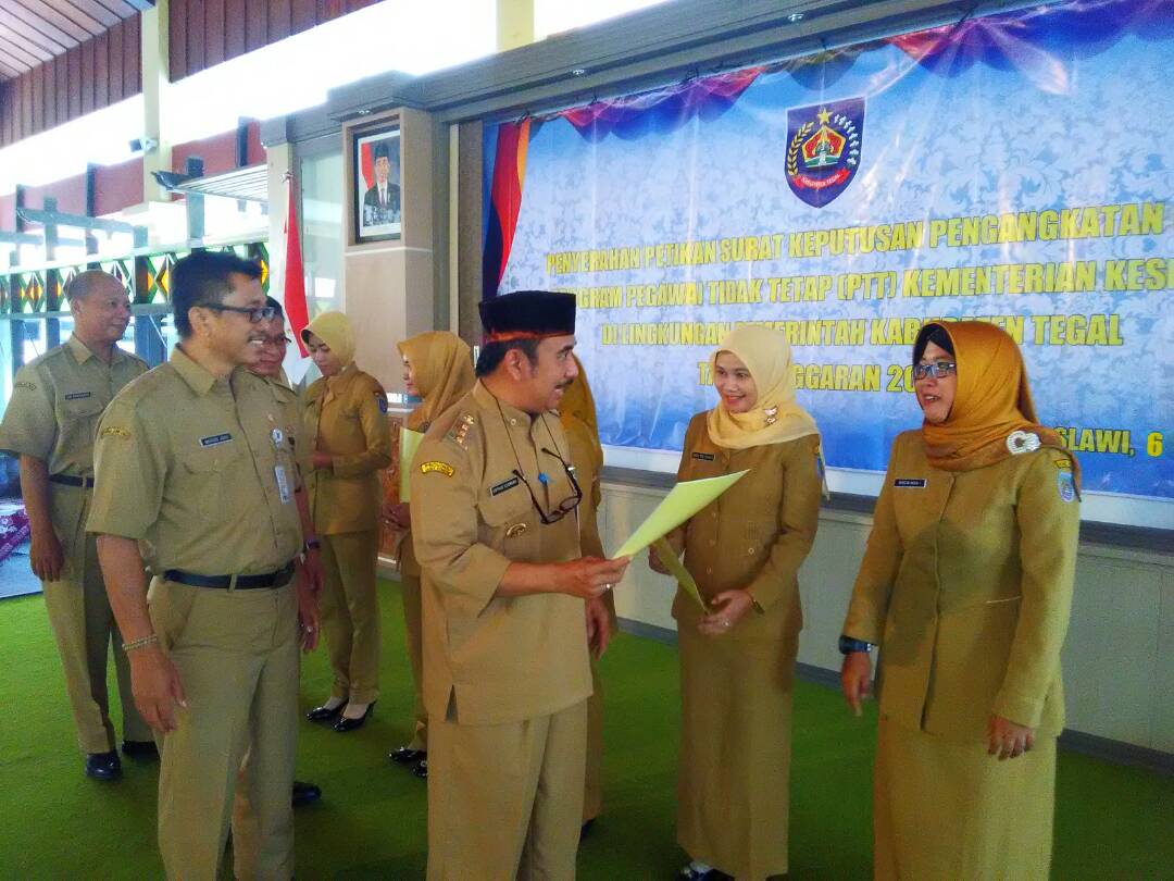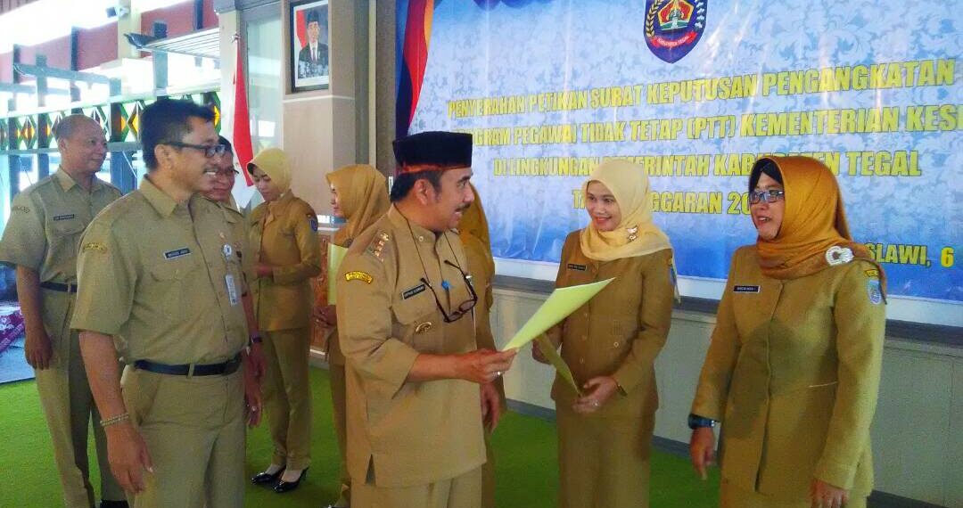 Sebanyak 224 Bidan Pegawai Tidak Tetap (PTT) kementerian Kesehatan diangkat menjadi Calon Pegawai Negeri Sipil Daerah (CPNSD) oleh Bupati Tegal, Enthus Susmono. Pada kesempatan itu juga diserahkan Surat Keputusan (SK) Pengangkatan CPNSD di Pendopo Amangkurat, Selasa (6/6).