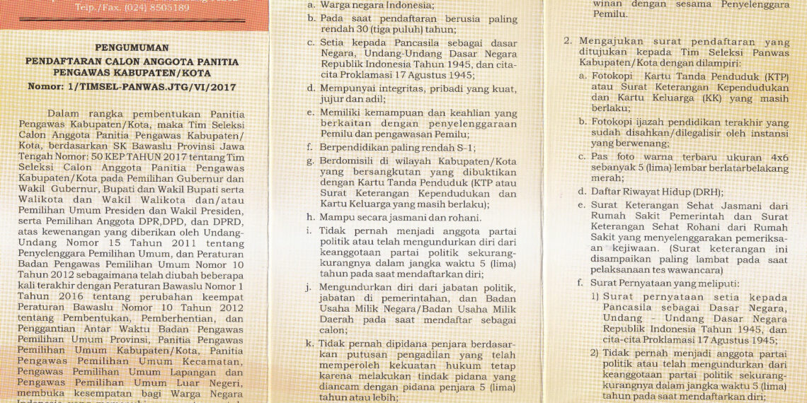 Berkas pendaftaran seperti Fotokopi KTP, KK, ijazah terakhir dan berkas lainnya dapat  sudah bisa dikirimkan Bawaslu Prov Jateng mulai tanggal 17-24 Juni 2017. Proses pengiriman dapat diantar langsung, email, atau fax ke Sekretariat Tim Seleksi Calon Anggota Panwas Kabupaten/Kota.