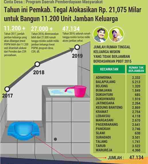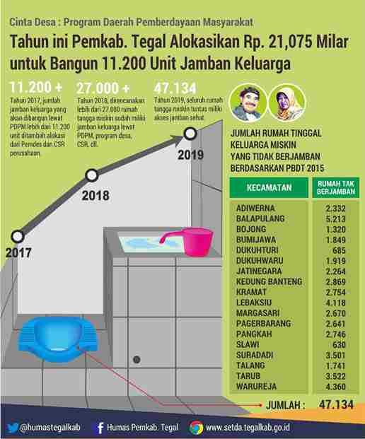 Berdasarkan Pemutakhiran Basis Data Terpadu (PBDT) Tahun 2015, jumlah rumah tangga miskin di Kabupaten Tegal yang belum memiliki askses jamban sehat mencapai 47.134 KK. Tahun ini Pemerintah Kabupaten Tegal mentargetkan 11.200 jamban keluarga terbangun melalui PDPM dengan indeks rata-rata per-unitnya Rp.1,8 juta, sesuai dengan standarisasi yang berlaku di Kementerian Kesehatan. Adapun seluruh penerima manfaatnya adalah keluaga miskin yang masuk dalam PBDT 2015 dan telah disosialisasikan di 18 wilayah kecamatan oleh Tim Koordinasi Penanggulangan Kemiskian Daerah (TKPKD) Kabupaten Tegal beberapa waktu lalu.