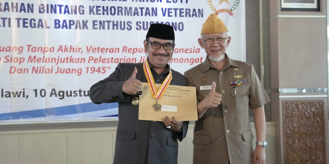 Slawi – Bertepatan dengan peringatan Hari Veteran Nasional Tahun 2017, Bupati Tegal, Enthus Susmono, mendapat anugerah Bintang Legiun Veteran RI, Kamis (10/8) di Pendopo Ki Gede Sebayu. Acara penyerahan tersebut juga dihadiri oleh Forkompimda dan anggota LVRI serta bebrapa siswa SMA yang berada di Kecamatan Slawi.