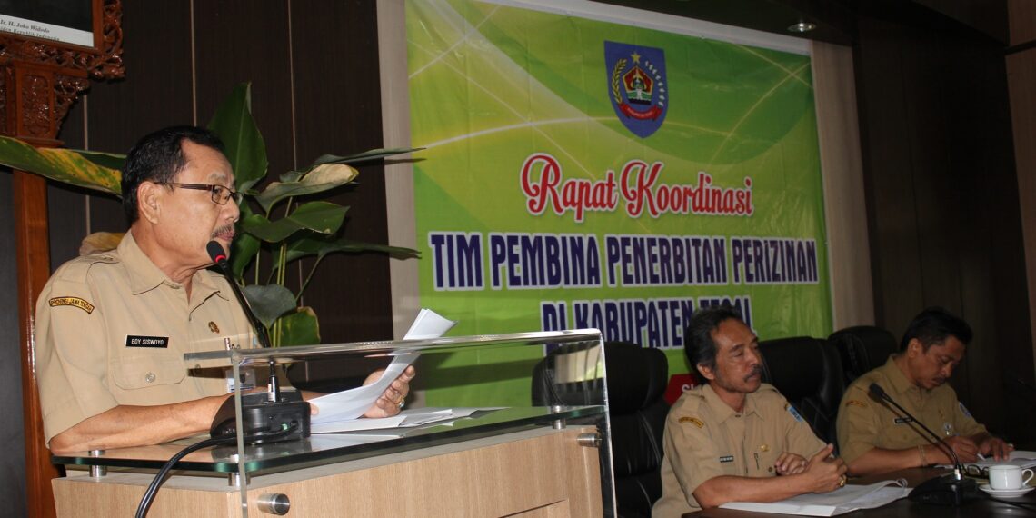 SLAWI – Pemerintah Kabupaten Tegal melalui Dinas Penanaman Modal dan Pelayanan Terpadu Satu Pintu(DPMPTSP) Kabupaten Tegal melaksanakan rakor tim pembina dan tim teknis perizinan di Ruang Rapat Bupati Tegal, Selasa (15/8) guna membahas tentang permasalahan yang dihadapi untuk mewujudkan pelayanan prima. Hadir dalam acara tersebut Sekda Kab. Tegal, Asisten Administrasi Pembangunan, Kepala Dinas PMPTSP dan seluruh Kepala OPD di lingkungan Pemkab. Tegal.