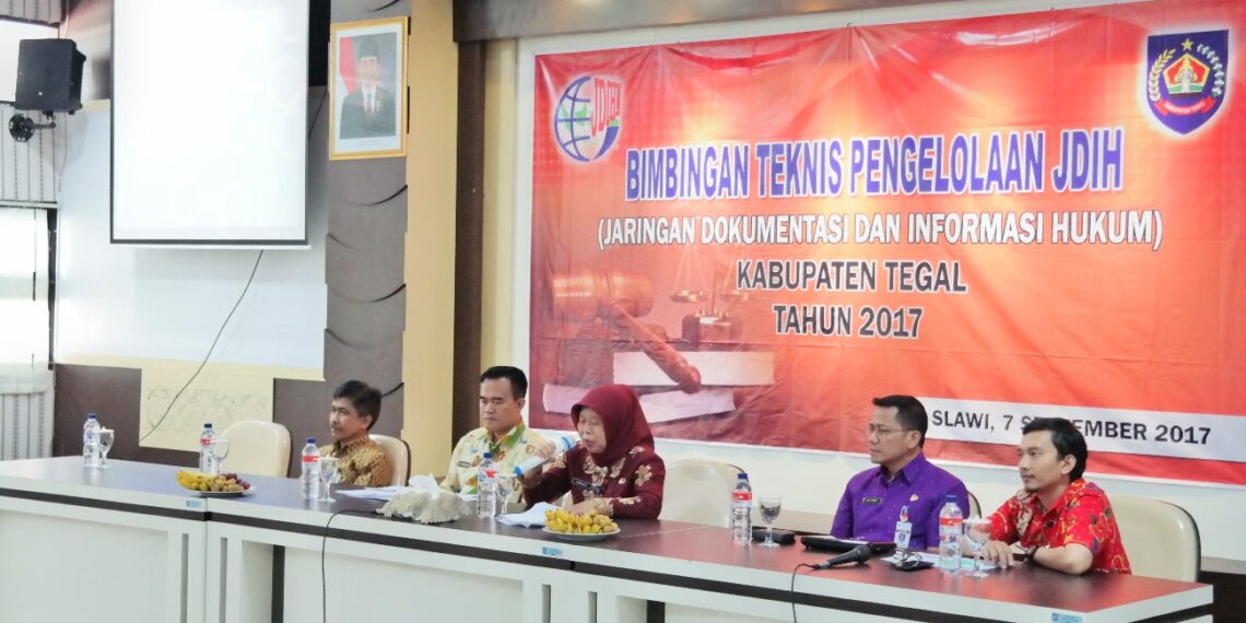 SLAWI – Pemerintah Kabupaten Tegal oleh Kemenkumham mengadakan bimtek JIDHN(Jaringan Dokumen dan Informasi hukum nasional) di gedung Candra Kirana, kamis (07/09) guna membahas tentang pembinaan JDIH di 35 ab/kota. Acara yang diadakan setiap tahun tersebut bertujuan untuk mewujudkan pengelolaan dokumentasi dan informasi yang terpadu dan terintegrasi di berbagai instansi pemerintah dan mengembangkan kerjasama yang efektif antara pusat jaringan dan anggota jaringan serta sesama anggota jaringan untuk penyediaan dokumen dan informasi hukum.