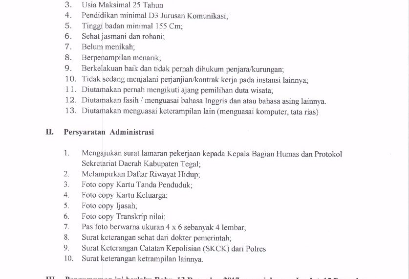 11. Diutamakan pernah mengikuti ajang pemilihan duta wisata;