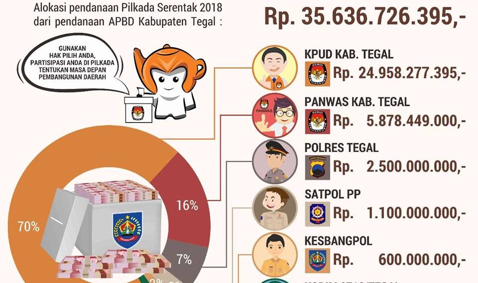 SLAWI – Pemilihan Kepala Daerah (Pilkada) serentak 2018 yang akan dilaksanakan pada tanggal 27 Juni 2018 memerlukan anggaran yang tidak sedikit. Pemerintah Kabupaten Tegal telah mengalokasikan anggaran yang mencapai Rp. 35,6 milyar guna mendukung suksesnya pelaksanaan Pilkada Serentak 2018 agar berjalan aman, tertib dan lancar.