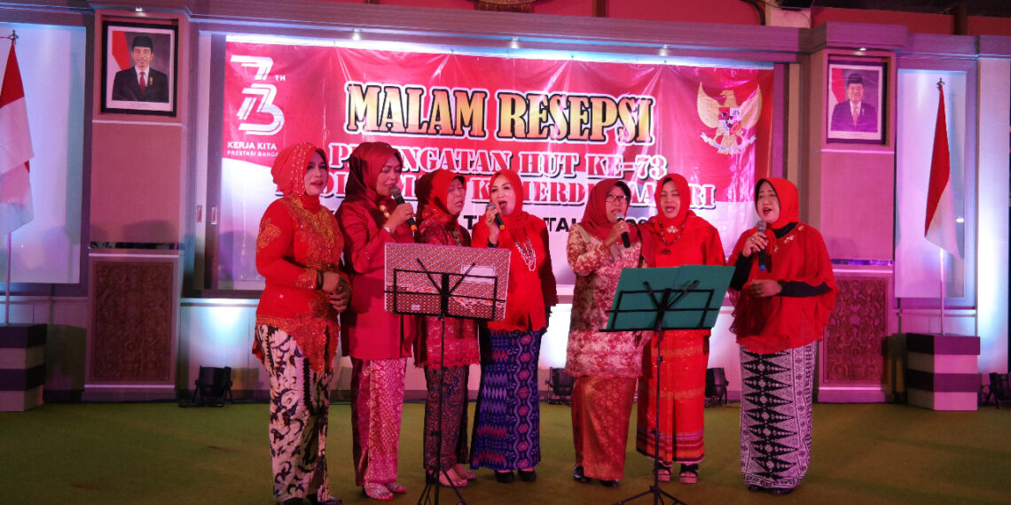 Slawi – Kegiatan malam resepsi Hari Ulang Tahun Ke-73 Kemerdekaan RI tingkat Kabupaten Tegal berlangsung meriah. Keseruan terlihat saat Plt. Bupati Tegal, melantunkan lagu, dengan didampingi para srikandi yang tergabung dari beberapa Kepala OPD Kab. Tegal, Jumat (17/8) malam.