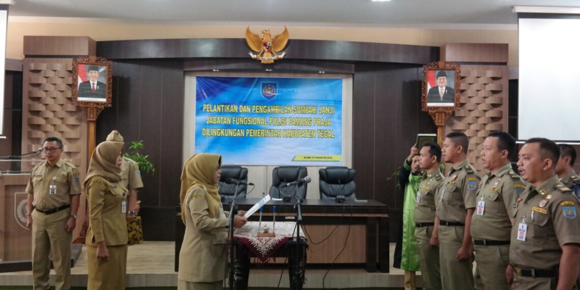 Slawi – Sebelas anggota Polisi Pamong Praja di lingkungan Pemkab Tegal, dilantik oleh Plt. Bupati Tegal, Umi Azizah, Senin (27/8) pagi. Dengan dilantiknya pejabat fungsional ini, Umi berharap kinerja kesatuan Polisi Pamong Praja semakin meningkat, semakin responsif, dan dekat dengan masyarakat.