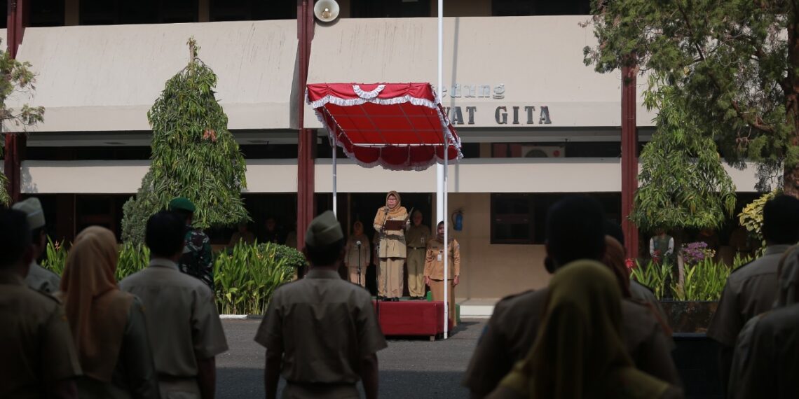 Slawi – Plt. Bupati Tegal, Umi Azizah menjadi inspektur upacara Peringatan Hari Kesaktian Pancasila tahun 2018, Senin (01/10/18) pagi, di Halaman Belakang Kantor Bupati.