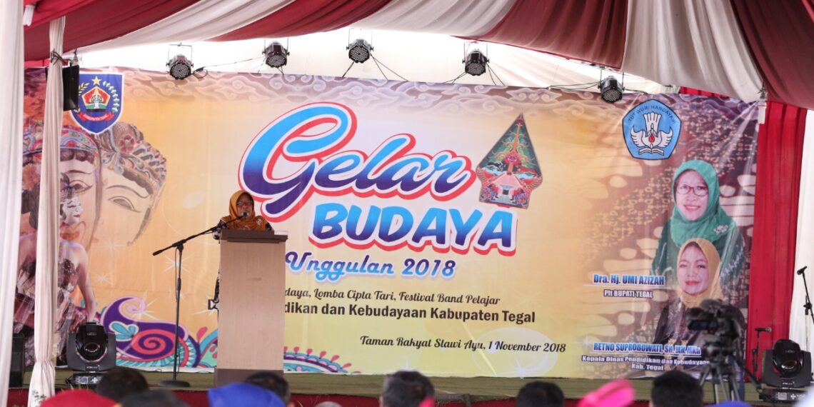 Hal tersebut disampaikan oleh Plt. Bupati Tegal, Umi Azizah dalam acara Gelar Budaya Unggulan Kabupaten Tegal, di Taman Rakyat Slawi, Kamis (01/11/18). “Upaya-upaya pelestarian seni budaya daerah harus terus kita tingkatkan, sehingga akan mewujudkan masyarakat yang cinta dengan tanah airnya,” ujarnya.