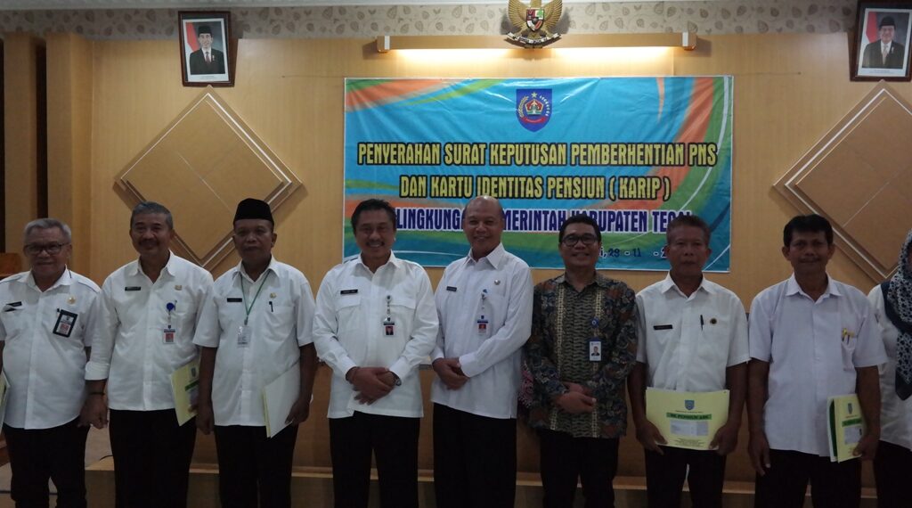 Penyerahan SK Pensiun dilakukan di Aula BKD Kab.Tegal, Rabu (28/11/18) oleh Sekretaris Daerah Kab.Tegal, Widodo Joko Mulyono didampingi oleh Kepala Badan Kepegawaian, Pendidikan dan Pelatihan Daerah, Edi Budiyanto.