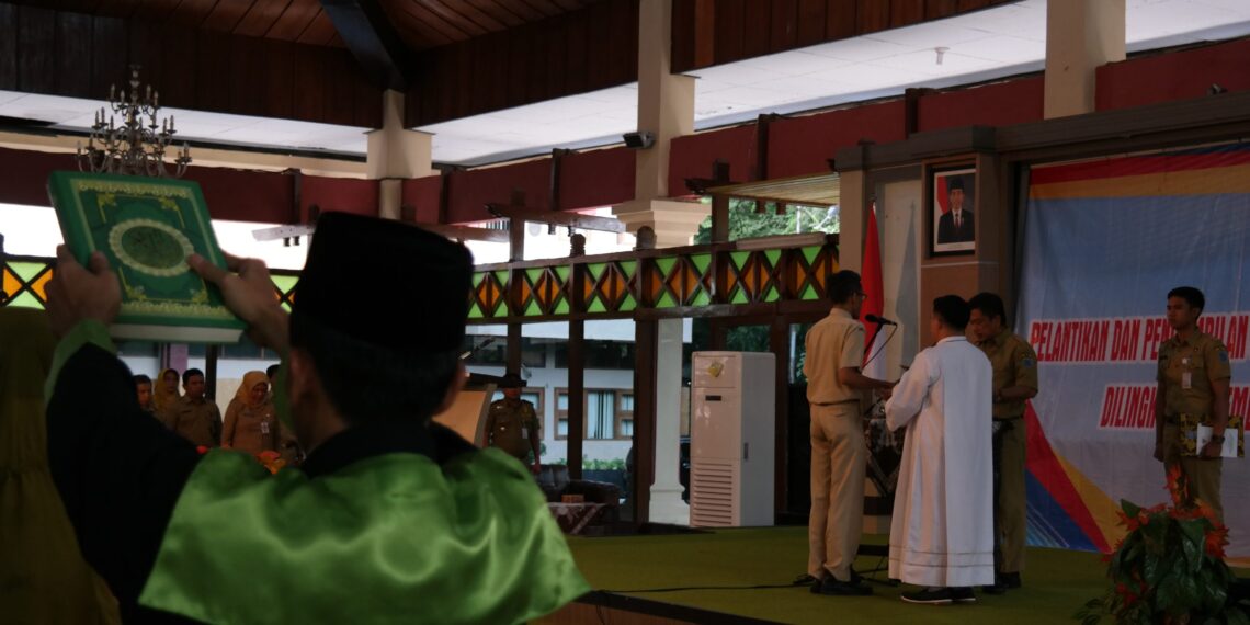 Slawi – Sekretaris Daerah Kabupaten Tegal, Widodo Joko Mulyono melantik 99 pejabat fungsional di lingkungan Pemerintah Kabupaten Tegal di Pendopo Amangkurat, Senin(03/12/18) siang. Dari jumlah tersebut, 62 jabatan fungsional yang dilantik adalah guru. Ketigapuluhtujuh sisanya, di antaranya adalah polisi pamong praja, pamong budaya, pengendali dampak lingkungan, teknik tata bangunan dan perumahan, auditor, P2UPD, dan pengelola pengadaan barang/ jasa.