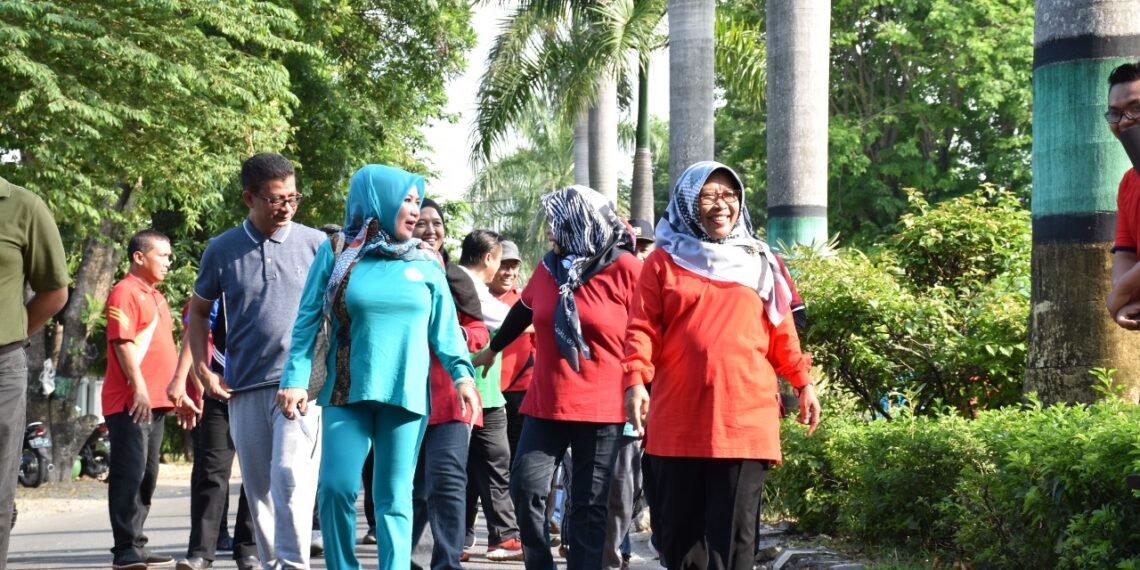 Slawi – Bupati Tegal, Umi Azizah didampingi Wakil Bupati Tegal, Sabilillah Ardie dan sejumlah Kepala OPD Kabupaten Tegal, berjalan kaki sepanjang dua kilometer. Berjalan mulai dari PD. BKK Slawi yang terletak di Jalan Ir. Juanda, Pakembaran sampai Jalan Gajah Mada, Bupati dan rombongan menanam 125 pohon tabebuya.