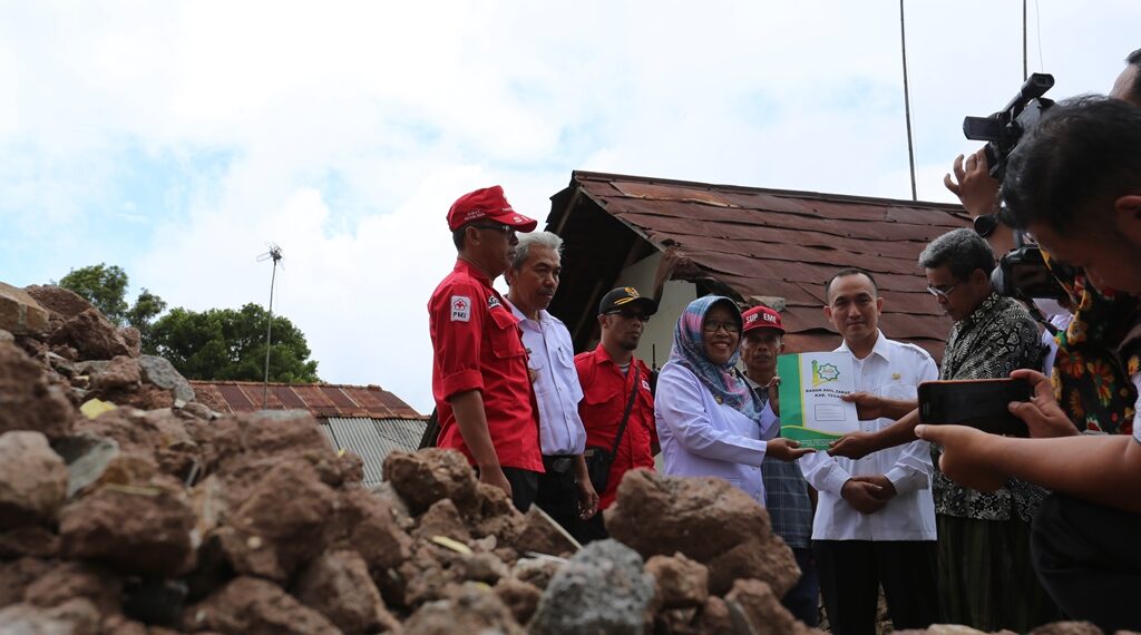 Slawi – Pasca terjadinya hujan lebat disertai angin kencang pada Sabtu (26/1) malam hari, mengakibatkan rumah salah satu warga di Desa Sumbaga, Kecamatan Bumijawa, rata dengan tanah. Mengetahui hal itu, Bupati Tegal, Umi Azizah langsung meninjau ke lokasi tersebut.