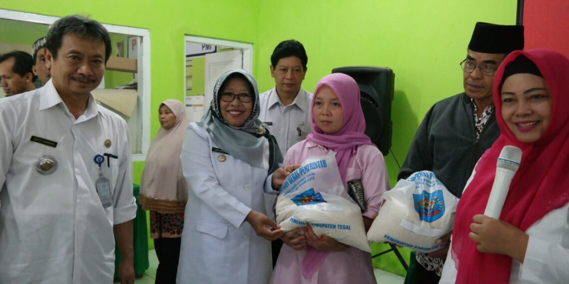 Bumijawa – Bupati Tegal, Umi Azizah memberikan bantuan beras sebanyak 1,56 kwintal untuk korban bencana longsor dan angin puting beliung yang berada di dua desa Kecamatan Bumijawa, Rabu (6/2) pagi di Balaidesa Desa Bumijawa.