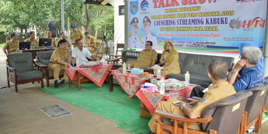 Slawi – Era revolusi industri 4.0 yang ditandai dengan digitalisasi media komunikasi dan segala aktifitas sosial yang terpusat di masyarakat, menjadikan peran pers semakin penting, semakin dicari. Sebagai pilar keempat demokrasi, pers menjadi rujukan informasi tentang kebenaran, terlebih ditengah maraknya berita palsu dan hoaks yang berseliweran di media sosial. Hal ini disampaikan Bupati Tegal Umi Azizah saat mengisi acara Kabar Bupatiku (Kabuku) di Kantor Dinas Komunikasi dan Informatika (Kominfo) Kabupaten Tegal hari Senin (11/2) pagi. Acara yang dipancarluaskan lewat Radio Slawi Ayu 99,3 FM dan di “live streaming” lewat kanal Youtube Pemkab Tegal maupun akun Facebook Humas Setda Kabupaten Tegal ini mengetengahkan tema Hari Pers Nasional 2019.