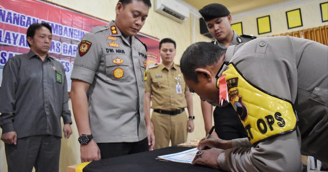 Penandatanganan deklarasi pencanangan zona integritas berjalan lancar. Disaksikan oleh Kapolres Tegal, Wakapolres Tegal, Wakil Bupati Tegal, Kajari Tegal, Perwakilan Kodim 0712/ Tegal, dan Ketua Pengadilan Negeri Slawi. (01)