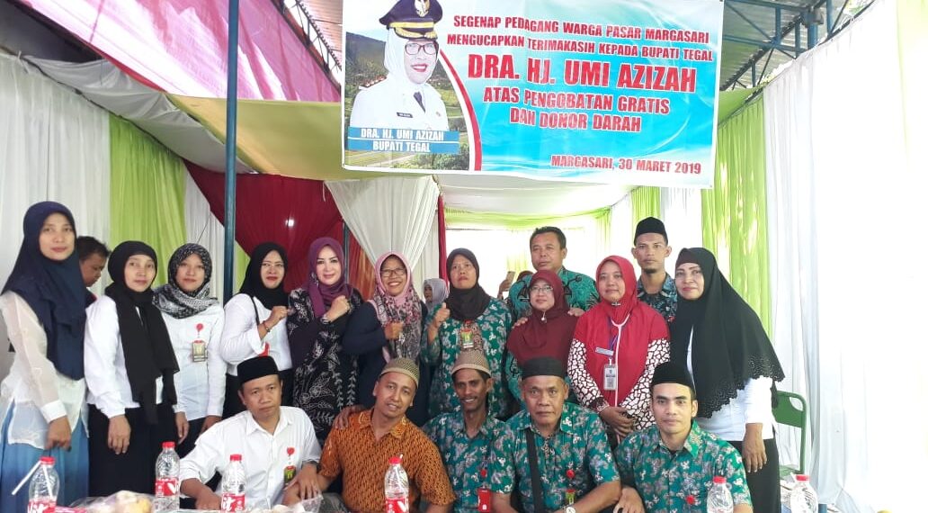 Margasari-Bupati Tegal Umi Azizah hadir dalam acara pengobatan gratis dan donor darah untuk pedagang pasar Margasari,Sabtu(30/3)bertempat di relokasi pasar Margasari.bekerja sama dengan pemerintah Kabupaten Tegal,dengan Dinas kesehatan dibantu Puskesmas Margasari dan PMI.
