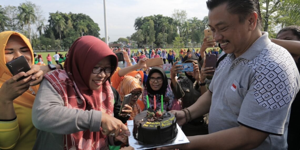Slawi – Pada acara Senam Bersama Dalam Rangka Peringatan Hari Kartini Ke-140 tingkat Kabupaten Tegal Tahun 2019, Bupati Tegal, Umi Azizah mendapat kejutan dari Sekretaris Daerah Kabupaten Tegal, Widodo Joko Mulyono, Jumat (5/4) pagi.