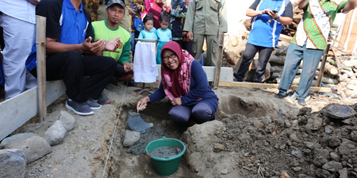 Kajen – Bupati Tegal, Umi Azizah melakukan prosesi peletakan batu pertama pembangunan rumah korban longsor yang terjadi di RT 04/ RW 09 di Dukuh Blimbing, Desa Kajen, Kecamatan Lebaksiu. Pembangunan rumah para korban longsor ini, tak terlepas dari bantuan para donatur maupun CSR yang ada di Kabupaten Tegal.