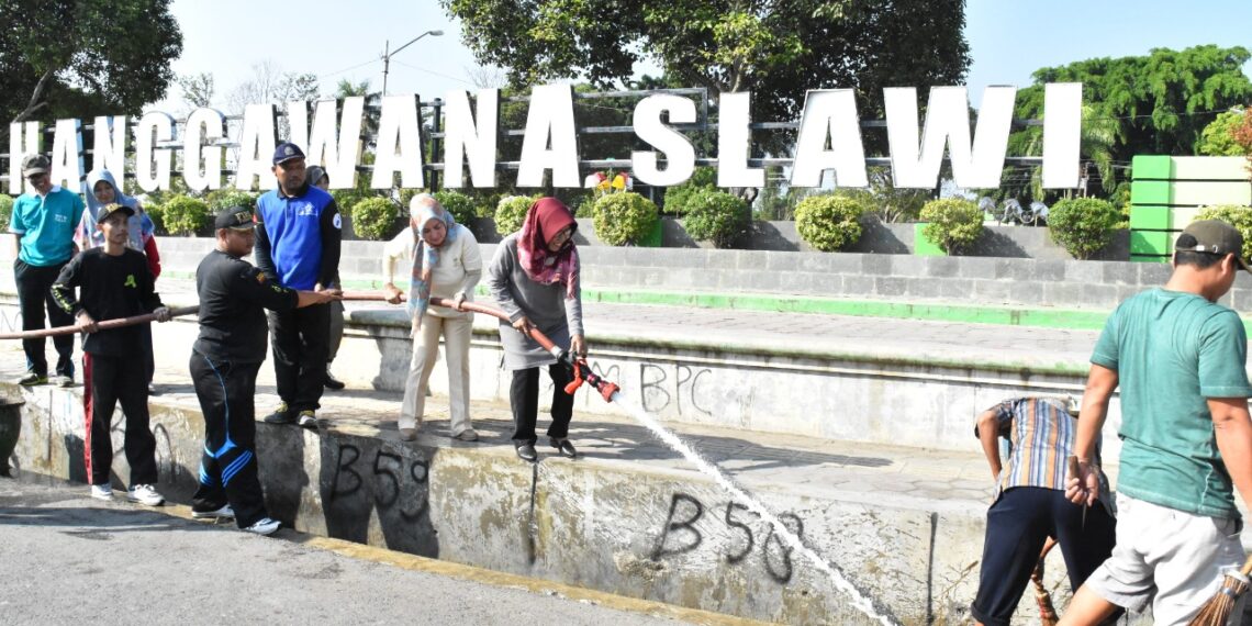 Slawi – Menjawab aduan masyarakat perihal Alun-alun Hanggawana yang menyebarkan bau tak sedap, Bupati Tegal Umi Azizah merespon cepat dengan mengadakan giat penyemprotan selokan. Kegiatan jumat (21\6) pagi itu, melibatkan Dinas Perdagangan, Koperasi dan UKM, Damkar, Satpol PP, Dinas Lingkungan Hidup serta Paguyuban pedagang Karya Mandiri.