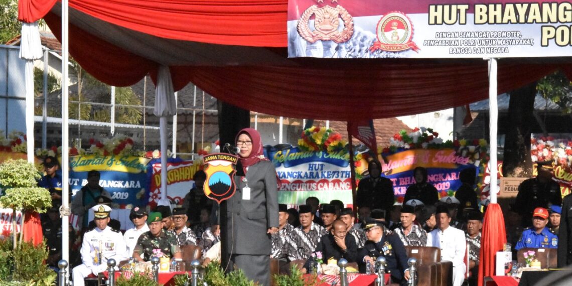 Dukuhwaru – Upacara peringatan Hari Ulang Tahun Bhayangkara ke-73 Tahun 2019 diselenggarakan di Lapangan Dukuhwaru, Kecamatan Dukuhwaru pada Rabu (10/7) pagi tadi. Dalam kesempatan ini, Bupati Tegal, Umi Azizah menjadi inspektur upacara. Turut hadir Kapolres Tegal, Dwi Agus Priyanto serta Dandim 0712/ Tegal, Richard Arnold Yeheskiel.