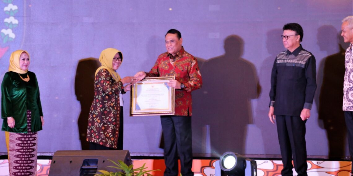 Semarang – Inovasi Pemkab Tegal dalam upayanya menanggulangi kemiskinan meraih penghargaan Top 99 Inovasi Pelayanan Publik dari Kementerian Pendayagunaan Aparatur Negara dan Reformasi Birokrasi (PANRB). Penghargaan ini diserahkan langsung oleh Menteri PANRB kepada Bupati Tegal Umi Azizah di acara Awarding Top 99 Inovasi Pelayanan Publik Tahun 2019 di Gumaya Tower Hotel Semarang, Kamis (18/07) malam. Tampak hadir menyaksikan diatas panggung, Menteri Dalam Negeri Tjahjo Kumolo dengan didampingi Gubernur Jawa Tengah Ganjar Pranowo.