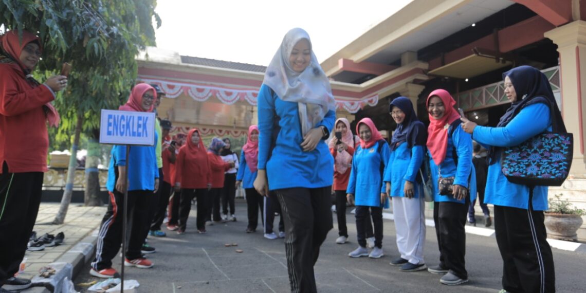 Slawi – Dalam rangka memperingati Hari Keluarga Nasional dan Hari Anak Nasional tahun 2019, Pemerintah Kabupaten Tegal menyajikan berbagai permainan tradisional di halaman Kantor Bupati Tegal, Jum’at (19\7). Ditemani Ketua Tim penggerak PKK Sisca Zulistia, Bupati Tegal Umi Azizah memimpin apel setelah itu senam bersama.