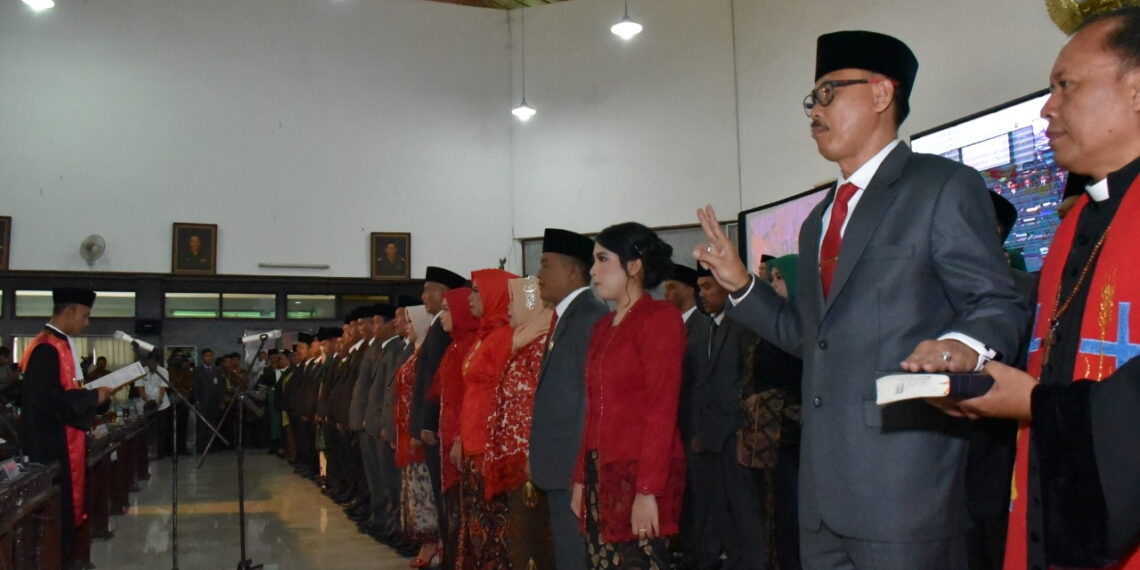 Slawi – Bupati Tegal Umi Azizah menghadiri acara pengucapan sumpah dan janji Dewan Perwakilan Rakyat Daerah (DPRD) Kabupaten Tegal periode 2019-2024, di Ruang Rapat Paripurna DPRD, Rabu (28/8) pagi. Dalam acara tersebut, Umi mengharapkan kepada para anggota DPRD yang telah dilantik dapat menjalankan amanah dengan kerja keras, penuh dedikasi dan tanggung jawab.
