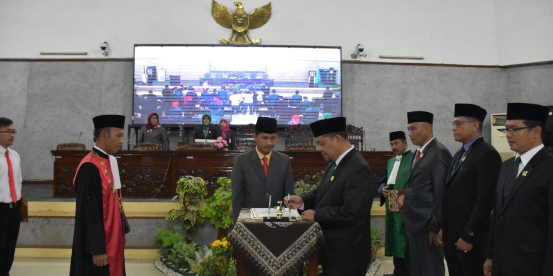 Slawi – Setelah sebelumnya tapuk pimpinan DPRD Kabupaten Tegal dipegang Noviatul Faroh, Rabu (25/9) diadakan Prosesi Pengucapan Sumpah dan Janji Pimpinan DPRD definitif Kabupaten Tegal Masa Jabatan Tahun 2019-2024. Bupati Tegal Umi Azizah hadir mengucapkan selamat kepada Ketua DPRD Agus Salim serta mengajak bersama-sama bekerja membangun masyarakat Kabupaten Tegal yang yang lebih sejahtera, mandiri, unggul, berbudaya, dan berakhlak mulia.