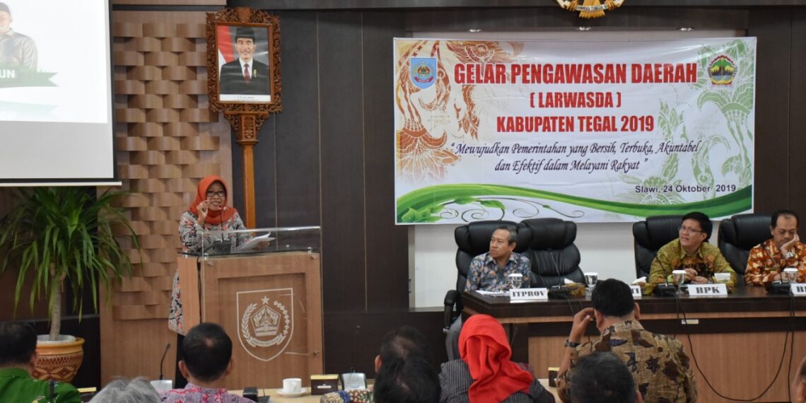Slawi – Bupati Tegal Umi Azizah pada saat membuka acara Gelar Pengawasan Daerah (Larwasda) Kabupaten Tegal Tahun 2019 mengungkapkan bahwa sebagai abdi negara atau pelayan masyarakat harus memahami posisinya di birokrasi sebagai mesin-mesin penggerak pembangunan, pun memiliki tanggung jawab besar untuk menjaga akselerasi kinerja mesin di birokrasi. Meningkatkan kecepatan dan kemampuannya untuk melayani masyarakat, men-deliver barang dan jasa publik untuk meningkatkan kesejahteraan masyarakat yang berkeadilan.