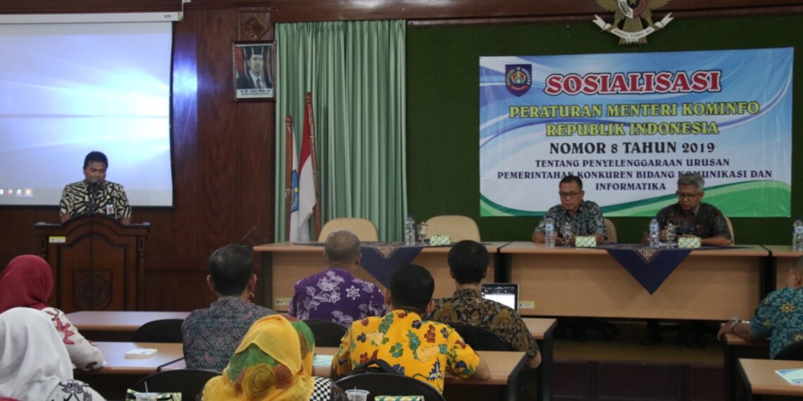 Hal ini disampaikan Bupati Tegal dalam sambutannya yang dibacakan oleh Staf Ahli Bupati Tegal bidang SDM dan Kemasyarakatan, Abasari, pada acara sosialisasi Peraturan Menteri Nomor 8 Tahun 2019 tentang Penyelenggaraan Urusan Pemerintahan Konkuren Bidang Komunikasi Informatika, Kamis (24/10) di Aula BPKAD Kabupaten Tegal.