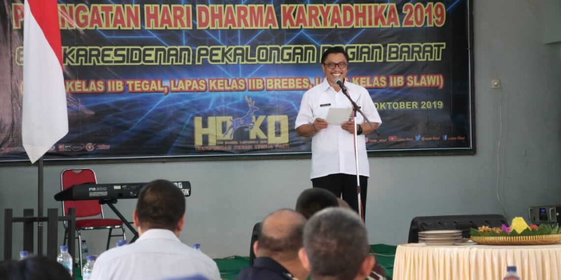 Slawi – Peringatan Hari Dharma Karyadhika 2019 diikuti oleh Lembaga Pemasyarakatan se-Eks Karesidenan Pekalongan bagian barat, Rabu (30/10) di Lapas Kelas IIB Slawi. Sekretaris Daerah Kabupaten Tegal Widodo Joko Mulyono Hadir memberi sambutan mewakili Bupati Tegal bersama Wakapolres Heru Budiharto. Dikatakan Joko, membentuk SDM unggul untuk melaksanakan peran strategis Kementrian Hukum dan HAM tidak ringan.