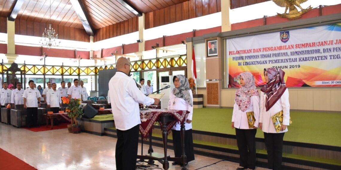 Slawi – Setiap Aparatur Sipil Negara atau ASN di birokrasi harus paham betul, bahwa posisinya adalah sebagai mesin penggerak pembangunan. Sehingga, setiap ASN harus dapat menjadi sosok Smart ASN sebagai gambaran sosok aparatur yang berintegritas, nasionalis, profesionalis dan berwawasan global. ASN yang memiliki daya saing, yang mampu mengikuti perkembangan zaman, terbuka kepada publik serta mampu memberikan contoh dan pelayanan yang baik kepada masyarakat. Hal tersebut disampaikan Bupati Tegal Umi Azizah saat acara Pengambilan Sumpah Jabatan dan Pelantikan Pejabat Pimpinan Tinggi Pratama, Pejabat Administrator dan Pejabat Pengawas di Lingkungan Pemkab Tegal, di Pendopo Amangkurat, Rabu (30/10) pagi tadi.