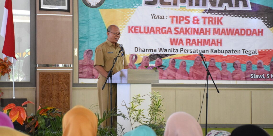 Slawi – Kasus perceraian yang terjadi di Kabupaten Tegal setiap tahunnya kian bertambah. Dari data yang ada, kasus perceraian di Pengadilan Agama Kelas I A Slawi pada tahun 2017 jumlahnya 4.050 kasus dan terus meningkat di tahun 2018 menjadi 4.212 kasus. Dari banyaknya kasus yang terjadi, salah satu faktor penyebabnya adalah pasangan yang meninggalkan salah satu pihak disusul dengan faktor ekonomi. Untuk itu, Pemerintah Kabupaten Tegal melalui Dharma Wanita Kabupaten Tegal menggelar acara Seminar Tips dan Trik Keluarga Sakinah Mawadah Wa Rahmah atau Samawa di Pendopo Amangkurat Setda Kabupaten Tegal, Selasa (5/11) pagi.