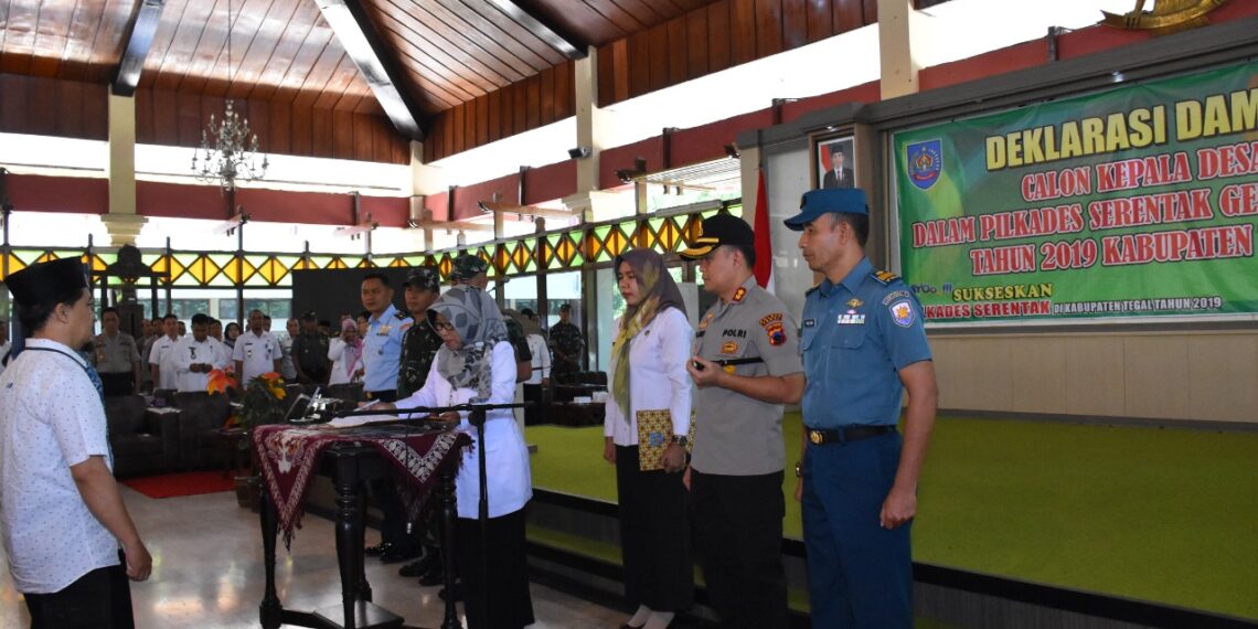 Slawi – Sebanyak 420 Calon Kepala Desa yang akan mengikuti Pemilihan Kepala Desa (Pilkades) Gelombang III Tahun 2019 melakukan deklarasi damai di Pendopo Amangkurat, Rabu (6/11) pagi. Deklarasi damai ini dipimpin langsung oleh Bupati Tegal Umi Azizah serta didampingi Dandim 0712/ Tegal Richard Arnold YS dan Kapolres Tegal Dwi Agus Prianto.