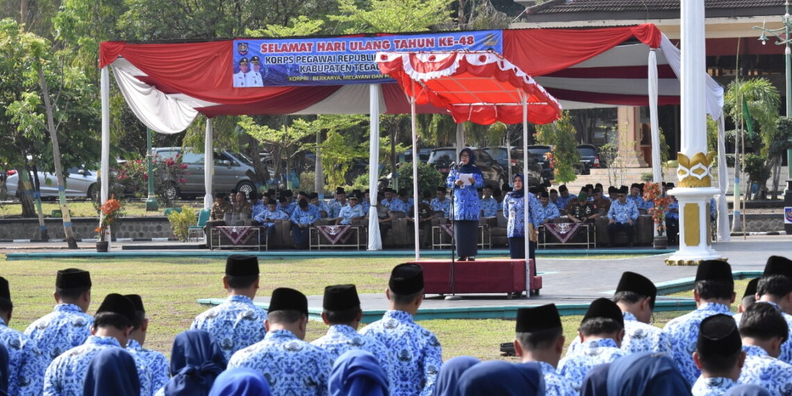 Upacara peringatan Hari KOPRI ke-48 Tingkat Kabupaten Tegal berjalan dengan lancar. Turut hadir Sekretaris Daerah Kabupaten Tegal, Danyonif 407/ PK, Kasdim 0712/ Tegal serta anggota KORPRI Kabupaten Tegal. (OI)