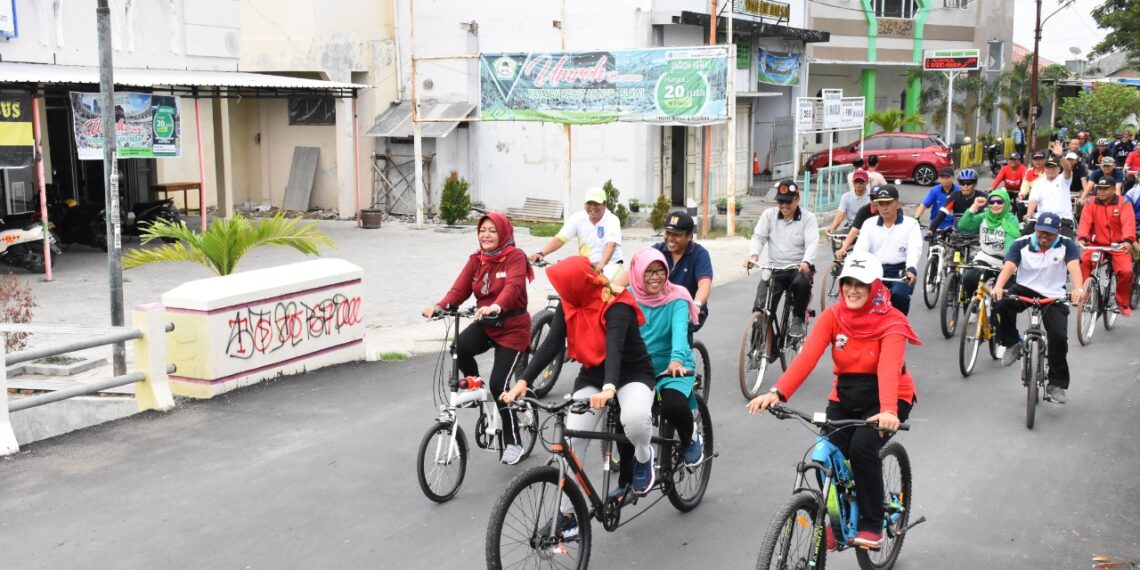 Slawi – Bupati Tegal Umi Azizah didampingi Sekretaris Daerah Kabupaten Tegal Widodo Joko Mulyono pada Jumat (13/12) pagi tadi bersepeda ria mengelilingi kawasan Slawi. Kegiatan bersepeda ini merupakan serangkaian acara HUT KORPRI ke-48 Tingkat Kabupaten Tegal. Tak hanya bersepeda, Umi juga menanam 1000 pohon ketapang kencana yang berlokasi di jalan Jatimulya – Lebakgowah – Yamansari.