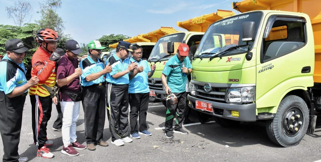 Slawi – Pemerintah Kabupaten Tegal melalui Dinas Lingkungan Hidup Kabupaten Tegal, menyerahkan pinjaman sarana prasarana pengelolaan sampah berupa 5 unit viar serta 4 armada truk yang ditandai dengan pemecahan kendil pada Jumat (20/12) di Terminal Dukuhsalam.