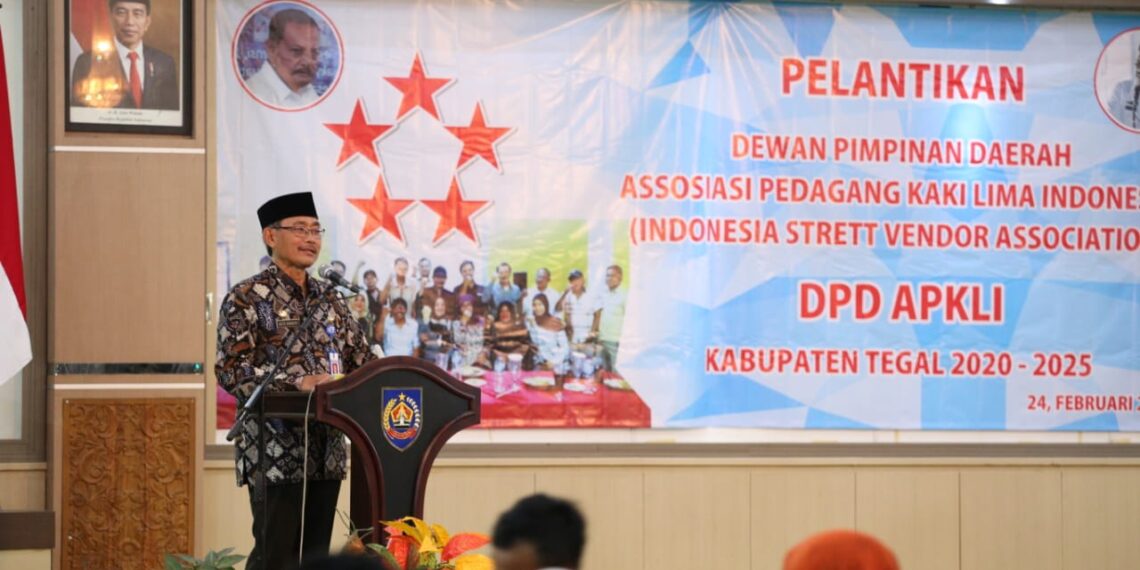 Slawi – Staf Ahli Bidang Hukum, Politik dan Pemerintahan Agus Subagyo menghimbau seluruh pedagang kaki lima di Kabupaten Tegal untuk tertib ketika membuka lapaknya. Hal ini disampaikan saat pelantikan Dewan Pimpinan Daerah Asosiasi Pedagang Kaki Lima Indonesia (DPD APKLI) Kabupaten Tegal Periode 2020-2025, Senin (24/2) di Pendopo Amangkurat.