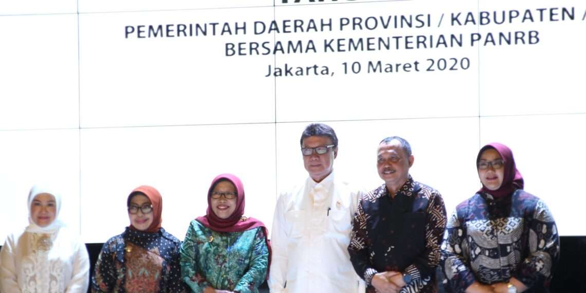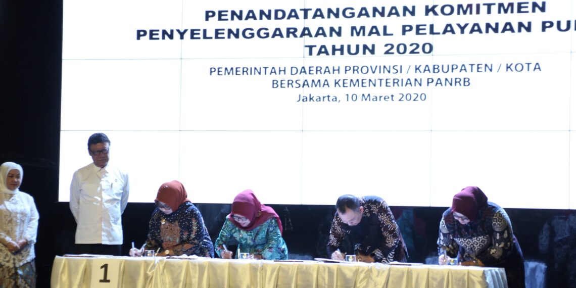 Jakarta – Demi mengoptimalkan pelayanan publik dan perizinan dengan cepat dan terbuka, Menteri Pendayagunaan Aparatur Negara dan Reformasi Birokrasi Tjahjo Kumolo yang didampingi oleh Deputi bidang Pelayanan Publik Dian Natalisa bersama 48 Pimpinan daerah melakukan penandatanganan bersama dalam Penyelenggaraan Mal Pelayanan Publik, Selasa (10/3) pagi, yang bertempat di ruang pertemuan Kemenpan-RB.