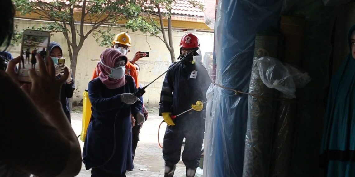 Dengan mengenakan alat pelindung diri yang telah disiapkan oleh personil Dinas Kesehatan (Dinkes) dan PMI Kabupaten Tegal, Umi pun menyemprotkan air yang aromanya mirip cairan pemutih ini ke dinding dan ke lantai. Area pertama yang menjadi sasarannya adalah mushola. Menurut Umi, mushola menjadi tempat berkumpulnya banyak orang dan berpotensi menjadi tempat penularan Corona Virus Disease 2019 atau Covid-19.
