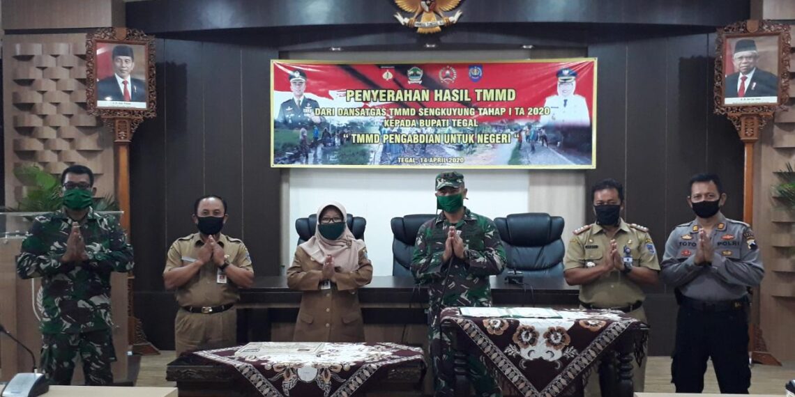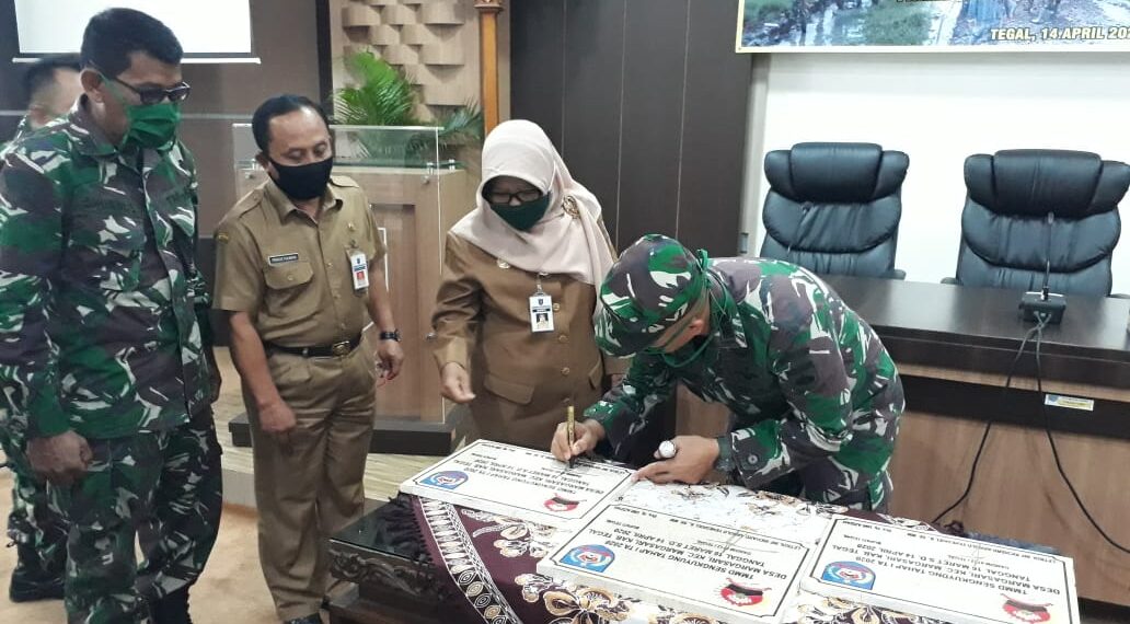 Slawi – Penandatanganan Berita Acara Serah Terima Hasil Kegiatan Tentara Manunggal Membangun Desa sengkuyung Tahap I 2020 dari Komandan Kodim 0712/Tegal Letkol. Inf. Richard Arnold Yeskiel S kepada Bupati Tegal Umi Azizah didampingi Plt Kepala Dinas Pemberdayaan Masyarakat dan Desa Prasetiawan, Selasa (14/4) bertempat di ruang rapat Bupati siang tadi.