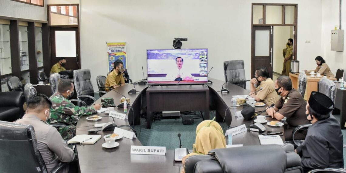 Slawi – Presiden Republik Indonesia Joko Widodo atau Jokowi menegaskan kepada para kepala daerah di Jawa Tengah untuk tidak tergesa-gesa dalam membuka dan mengoperasikan kembali destinasi wisata di masing-masing daerah. Hal tersebut disampaikan Jokowi melalui konferensi video dengan Gubernur Jawa Tengah Ganjar Pranowo serta seluruh kepala daerah se-Jawa Tengah pada Selasa (30/06/20) pagi di Ruang Rapat Sekda Kabupaten Tegal.