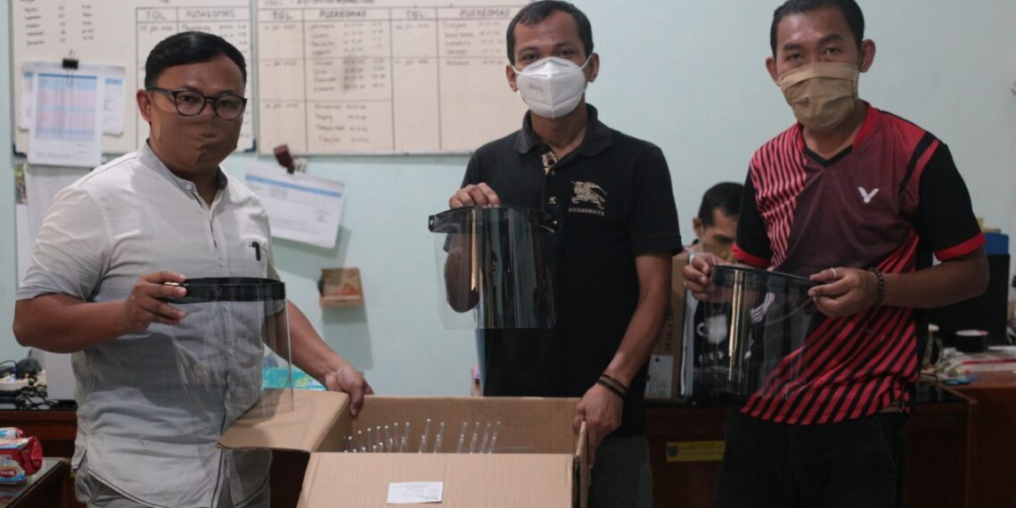 Slawi – Pemerintah Kabupaten Tegal menyumbang 60 buah face shield untuk kelompok sadar wisata (pokdarwis) Pasar Slumpring Desa Cempaka Kecamatan Bumijawa. Penyerahan face shield itu dilakukan oleh Kasi Surveilans dan Imunisasi Dinas Kesehatan (Dinkes) Kabupaten Tegal Eko Budi Prasrianto Prabowo kepada perwakilan pokdarwis Pasar Slumpring Arif Abrori di Laboratorium Dinkes Kabupaten Tegal pada Jumat (10/07/2020) sore hari.
