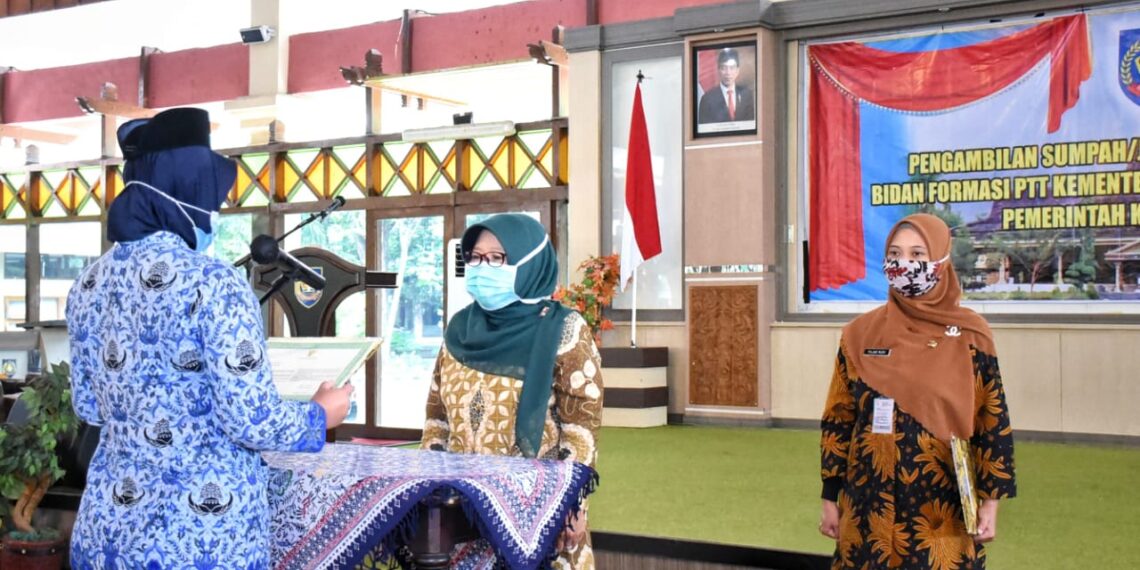 Slawi – Sebanyak 31 orang bidan dari formasi Pegawai Tidak Tetap (PTT) Kementerian Kesehatan (Kemenkes) Tahun 2019 resmi dilantik Bupati Tegal menjadi Pegawai Negeri Sipil (PNS) pada Kamis (09/07/2020) di Pendopo Amangkurat Setda Kabupaten Tegal. Dasar pengangkatan ini adalah Keputusan Presiden Nomor 25 Tahun 2018 tentang Pengangkatan Dokter, Dokter Gigi, Bidan PTT Kemenkes sebagai CPNS di Lingkungan Pemda.