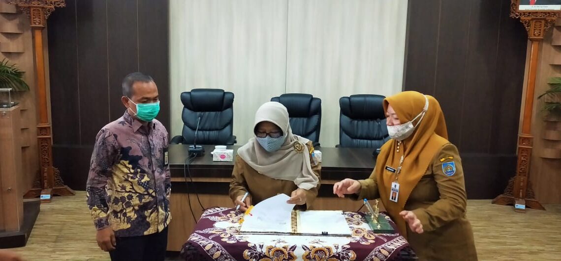 Slawi – Penyandang disabilitas yang tergabung dalam Difabel Slawi Mandiri (DSM) akan segera miliki rumah produksi. Hal ini terungkap saat Bupati Tegal Umi Azizah menandatangani nota kesepahaman pinjam pakai aset bangunan dan tanah milik Kementerian Keuangan (Kemenkeu) Republik Indonesia yang berada di Desa Banjaran, Kecamatan Adiwerna. Hadir mewakili pihak Kemenkeu, Kepala Kantor Pelayanan Pajak Pratama Tegal Budi Raharjo sebagai kuasa pengguna barang. Penandatanganan ini disaksikan oleh Kepala Dinas Sosial (Dinsos) Kabupaten Tegal Nurhayati, Selasa (25/08/2020) sore di Ruang Rapat Bupati Tegal.