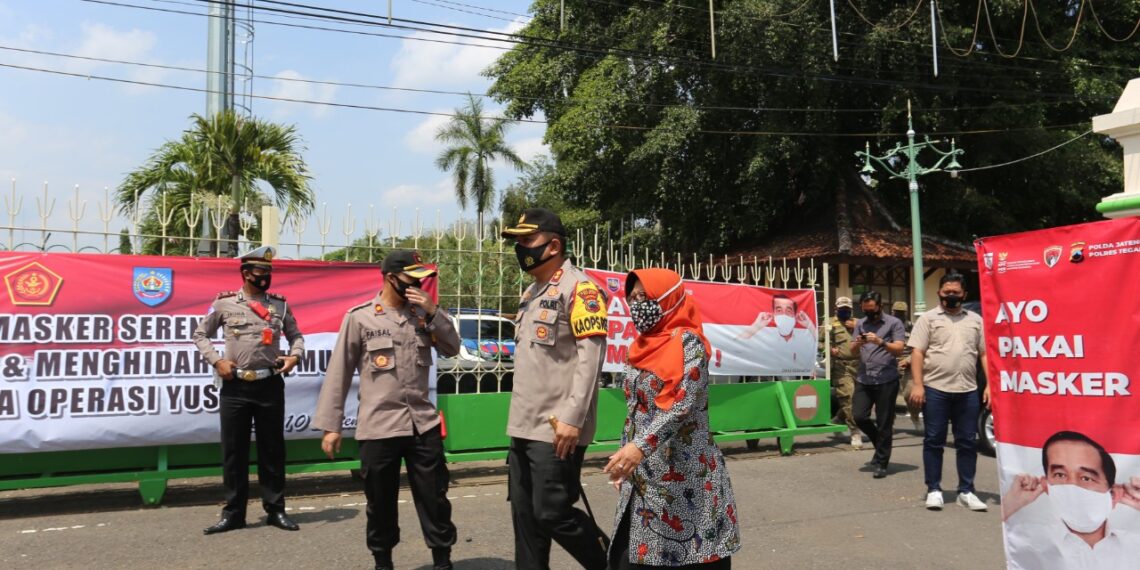 Slawi – Tingkatkan kewaspadaan masyarakat di tengah pandemi Covid-19, Bupati Tegal Umi Azizah dan Kapolres Tegal AKBP M Ikbal Simatupang beserta unsur TNI bagikan masker gratis di Alun-alun Hanggawana Slawi, Kamis (10/09/2020). Kegiatan ini merupakan bagian dari pembagian seratus ribu masker yang diadakan serentak di sembilan belas titik di wilayah Kabupaten Tegal.