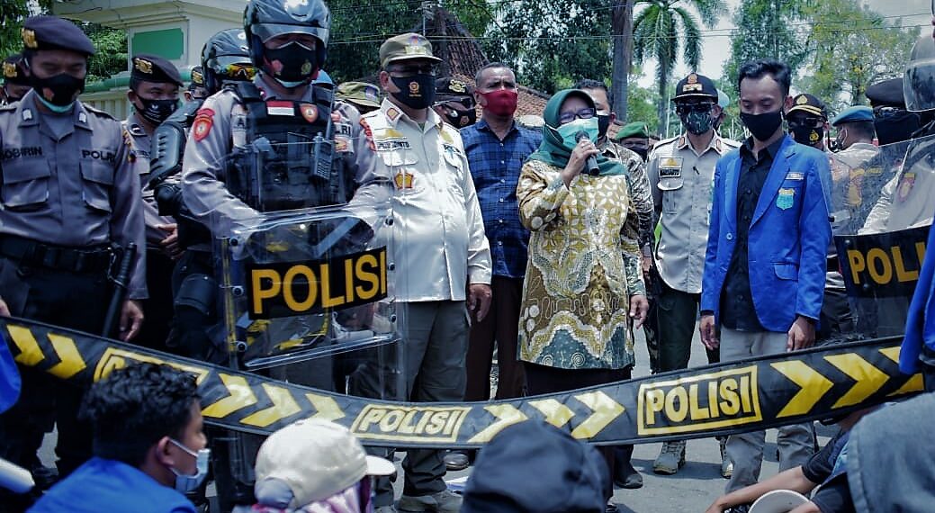 Slawi – Meski sempat terjadi aksi saling dorong antara mahasiswa dengan petugas keamanan karena ngotot ingin bertemu anggota DPRD Kabupaten Tegal, aksi unjuk rasa menentang Undang-Undang (UU) Cipta Kerja yang dilakukan oleh aliansi Pergerakan Mahasiswa Islam Indonesia (PMII) Cabang Tegal di depan Kantor Pemkab Tegal, Kamis (08/10/2020) siang berjalan damai. Aksi ini berakhir setelah Bupati Tegal Umi Azizah menemui para pendemo.