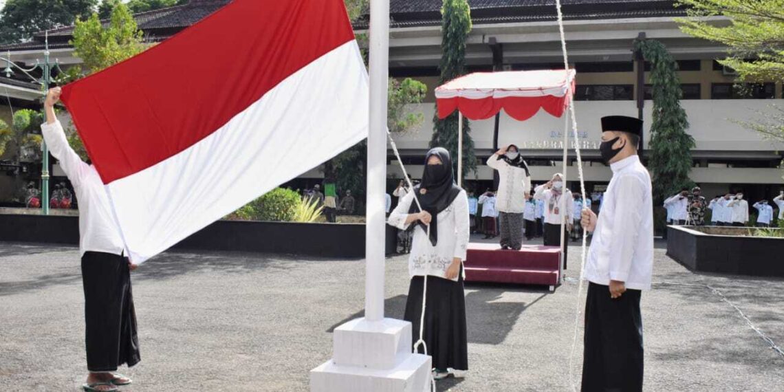 Pengibaran bendera merah putih saat Upacara Hari Santri Nasional Tahun 2020 di Halaman Belakang Kantor Bupati Tegal pada Kamis (22/10/2020) pagi.