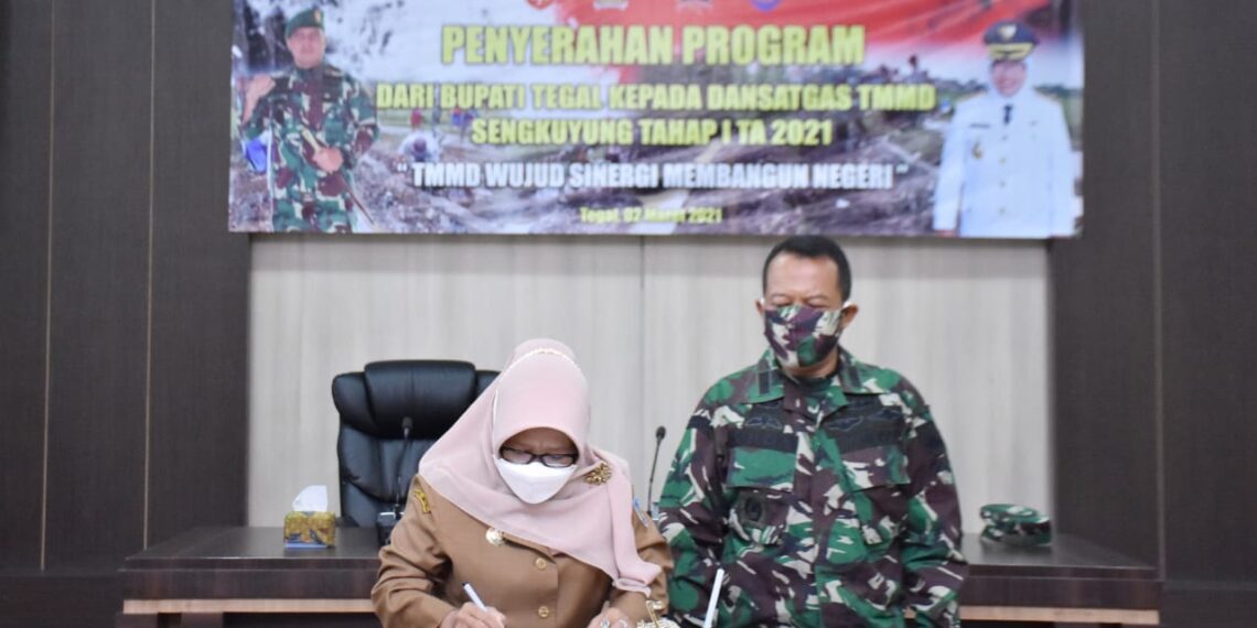 Slawi – Kegiatan TNI Manunggal Membangun Desa (TMMD) Sengkuyung Tahap I Tahun Anggaran 2021 resmi dibuka oleh Bupati Tegal Umi Azizah di Ruang Rapat Bupati Tegal pada Selasa, (2/3/2021) siang. Pembukaan program tersebut ditandai dengan Penandatanganan Berita Acara Penyerahan Program TMMD Sengkuyung Desa Bersole, Kecamatan Adiwerna, Kabupaten Tegal dari pemerintah Kabupaten (Pemkab) Tegal kepada Komando Distrik Militer (Kodim) 0712/Tegal.